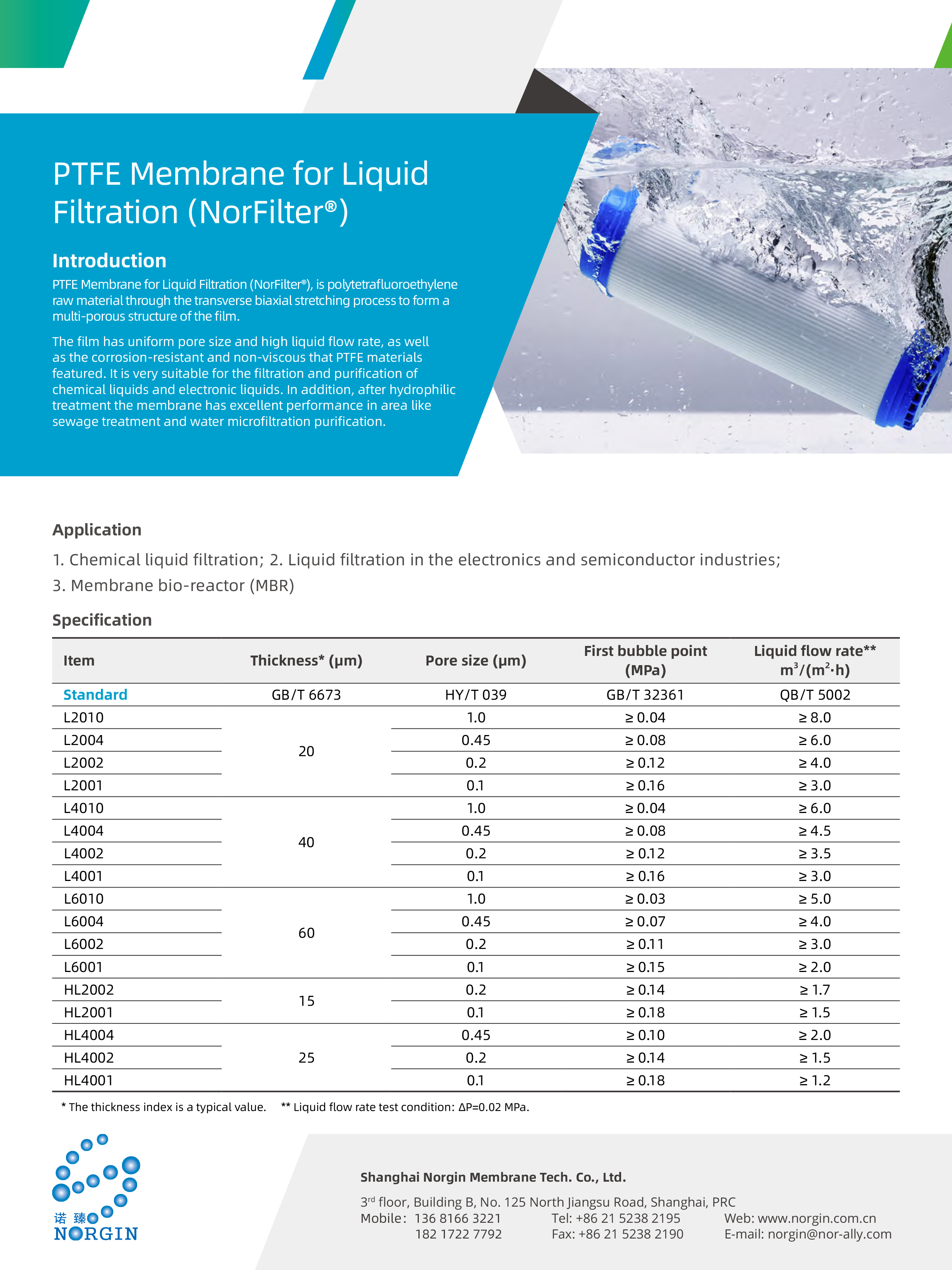 Application: 1. Chemical liquid filtration 2. Liquid filtration in the electronics and semiconductor industries 3. Membrane bio-reactor (MBR)