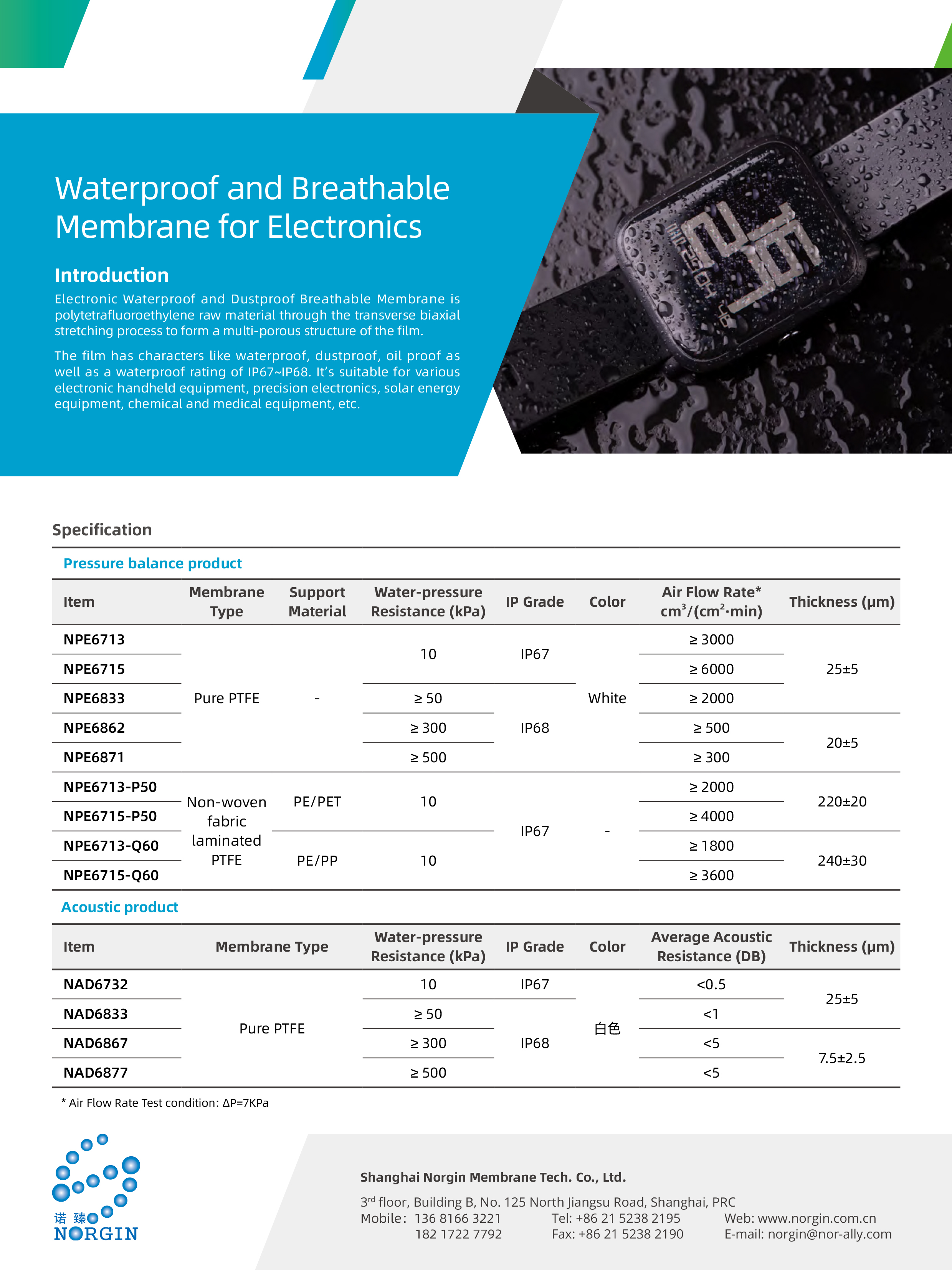 Introduction: Electronic Waterproof and Dustproof Breathable Membrane is polytetrafluoroethylene raw material through the transverse biaxial stretching process to form a multi-porous structure of the film. The film has characters like waterproof, dustproof, oil proof as well as a waterproof rating of IP67~IP68. It’s suitable for various electronic handheld equipment, precision electronics, solar energy equipment, chemical and medical equipment, etc.